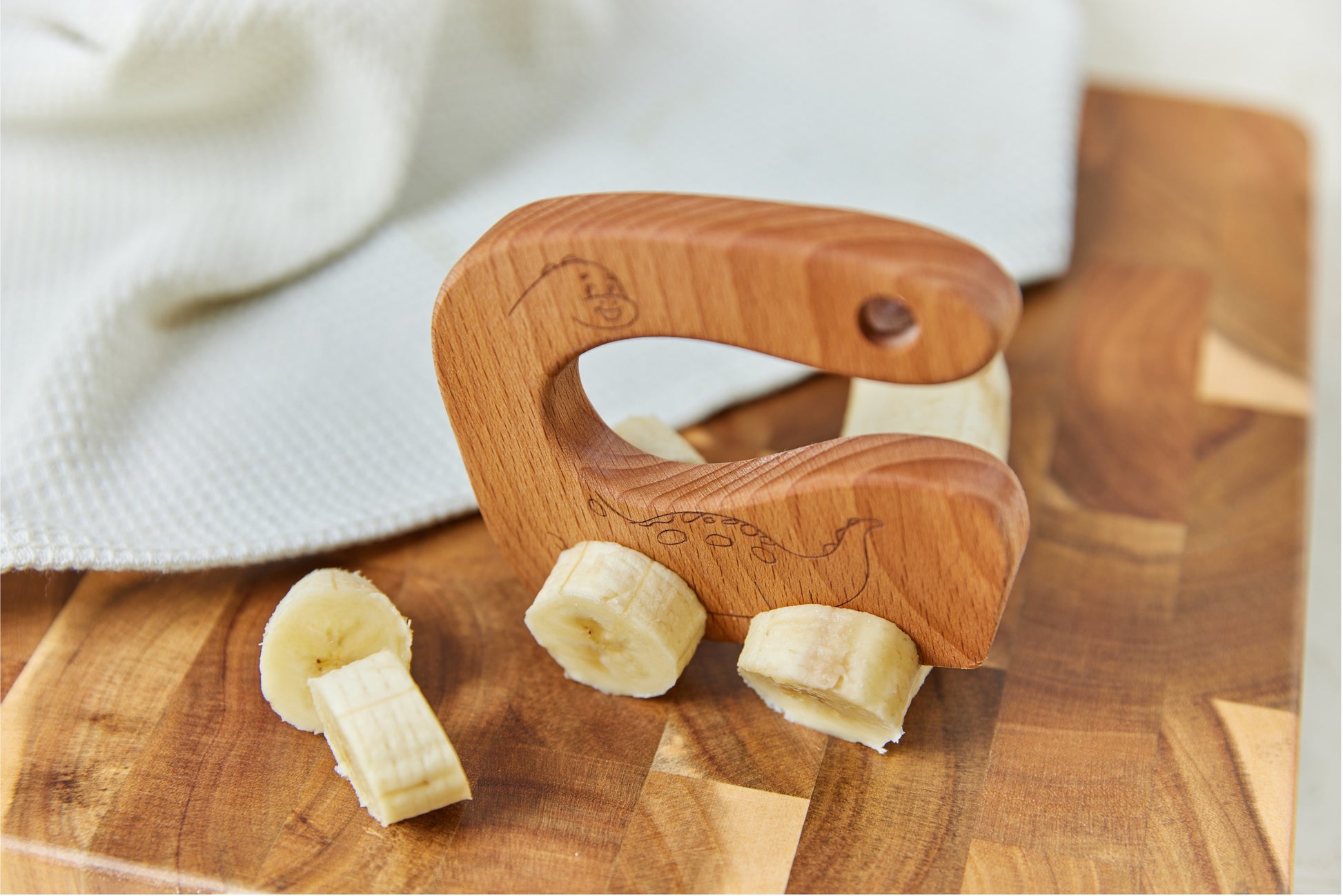 نقدم لكم سكينتنا الخشبية المصممة خصيصًا للأطفال لتساعدهم على أن يصبحوا أكثر استقلالية في المطبخ، وتتميز مع تصميم ديناصورنا الخاص. ميزاتها تشمل: